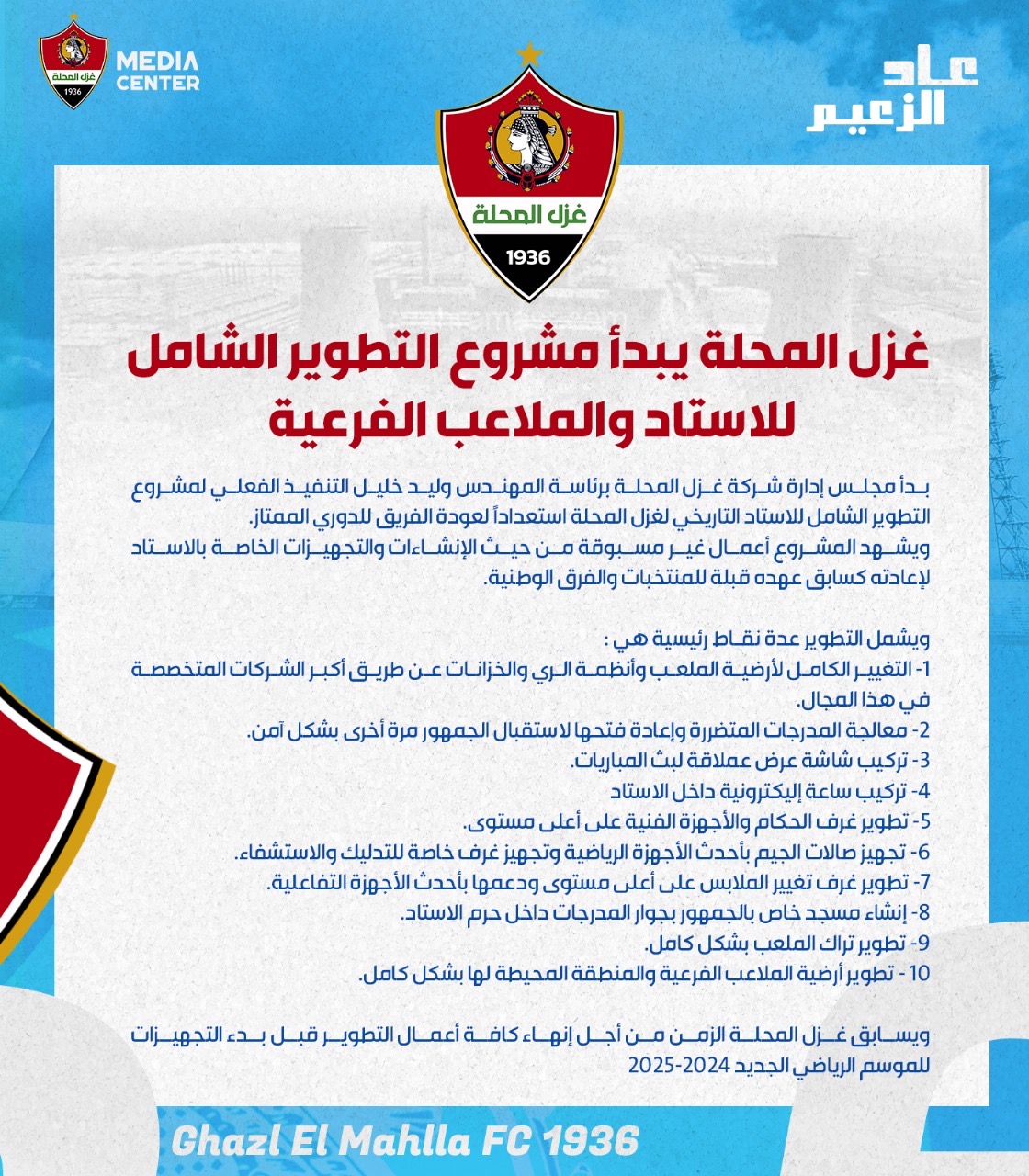 ونشر غزل المحلة بيانه الرسمي الذي جاء كالآتي:"بدأ مجلس إدارة شركة غزل المحلة برئاسة المهندس وليد خليل التنفيذ الفعلي لمشروع التطوير الشامل للاستاد التاريخي لغزل المحلة استعدادًا لعودة الفريق للدوري الممتاز".