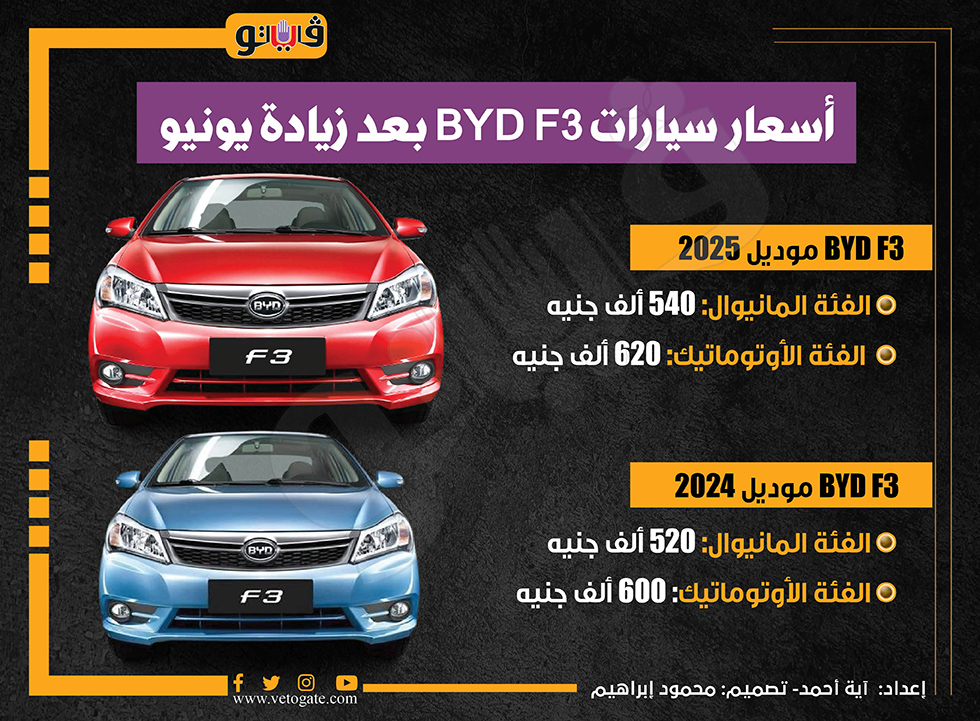 أسعار سيارات BYD F3 بعد زيادة يونيو (إنفوجراف) الإثنين 24/يونيو/2024 - 07:24 م 6/24/2024 7:24:41 PM سيارات آية أحمد شارك طباعة 18 حجم الخط شارك طباعة أسعار سيارات BYD ارتفاع سعر BYD F3 سيارات BYD F3 سيارات BYD سعر بي واي دي F3