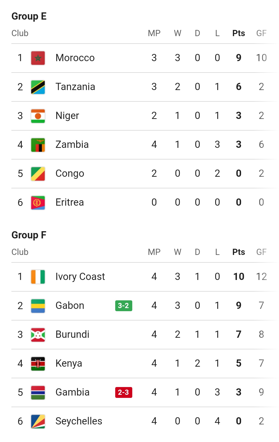 ويتصدر منتخب المغرب جدول ترتيب المجموعة الخامسة، برصيد 9 نقاط، بينما توقف رصيد زامبيا عند 3 نقاط في المركز الثاني، بنفس رصيد كل من النيجر وتنزانيا أصحاب النقاط الثلاث أيضًا بينما يحتل الكونغو المركز الأخير بدون رصيد.