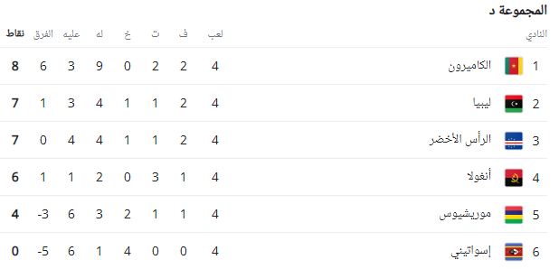 ترتيب مجموعة الكاميرون في تصفيات كأس العالم بعد الجولة الرابعة