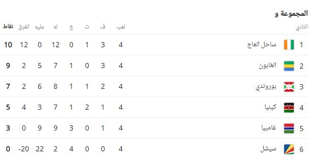 ترتيب مجموعة كوت ديفوار في تصفيات كأس العالم بعد الجولة الرابعة
