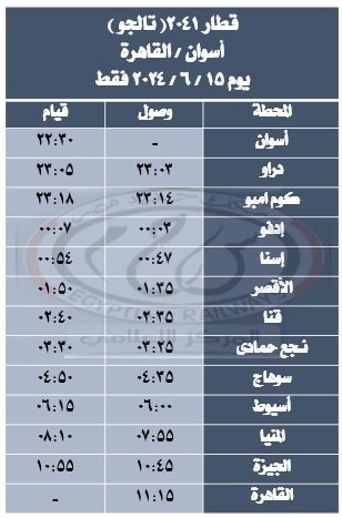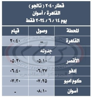 - تشغيل قطار 2041 ( تالجو ) الأقصر / القاهرة من محطة أسوان يوم 15 / 6 / 2024 فقط حيث يقوم من أسوان الساعة 10:30 مساءًا ويصل القاهرة الساعة 11:15 صباحًا طبقا للجدول المرفق.