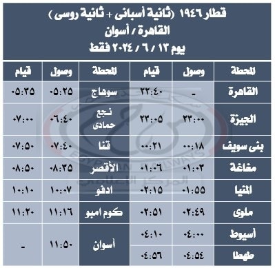 - يتم تشغيل قطار 1946 ( مكيف ) القاهرة / أسوان يوم 13 / 6 / 2024 فقط بتركيب ( 8 عربات ثانية مكيفة أسبانى + 5 عربات ثانية مكيفة روسى ) حيث يقوم من القاهرة الساعة 10:40 مساءً ويصل أسوان الساعة 11:50 صباحًا طبقًا للجدول المرفق.