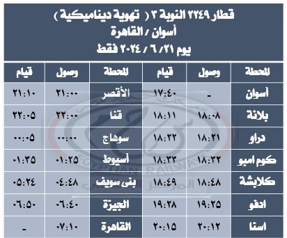 - يتم تشغيل قطار 2247 ( ثالثة تهوية ديناميكية) أسوان / القاهرة مخصوص للنادى النوبى الرياضى بالقاهرة يوم 21/6/2024 فقط بدلًا من يوم 20 / 6 / 2024 حيث يقوم الساعة 09:45 مساءًا من محطة أسوان يصل القاهرة الساعة 10:05 صباحًا طبقًا للجدول المرفق .
