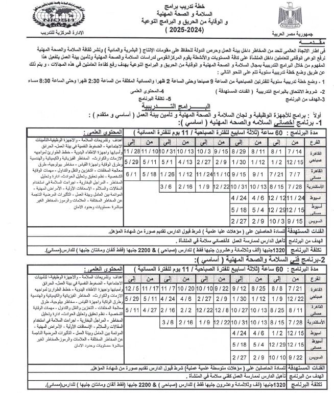 وبحسب بيان صحفي اليوم الأربعاء،أعلن المركز القومى لدراسات السلامة والصحة المهنية وتأمين بيئة العمل التابع لوزارة العمل، عن خطة عمله التدريبية السنوية للعام 2024 -2025، الخاصة ببرامج السلامة والصحة المهنية والوقاية من الحريق، والبرامج النوعية،والمُوضحة فى الإعلان المُرفق مع هذا البيان الصحفي.