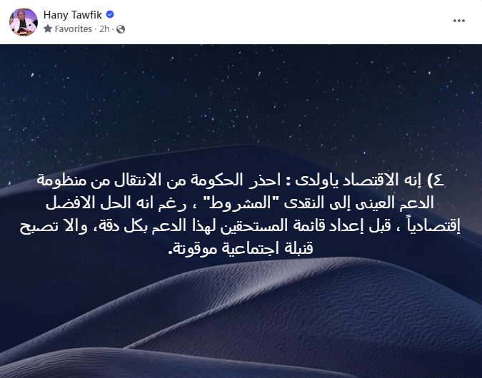 وقال الخبير الاقتصادي هاني توفيق في رسالته التحذيرية للحكومة: "احذر الحكومة من الانتقال من منظومة الدعم العينى إلى النقدى "المشروط"، رغم انه الحل الافضل اقتصاديًا، قبل إعداد قائمة المستحقين لهذا الدعم بكل دقة، وإلا تصبح قنبلة اجتماعية موقوتة."