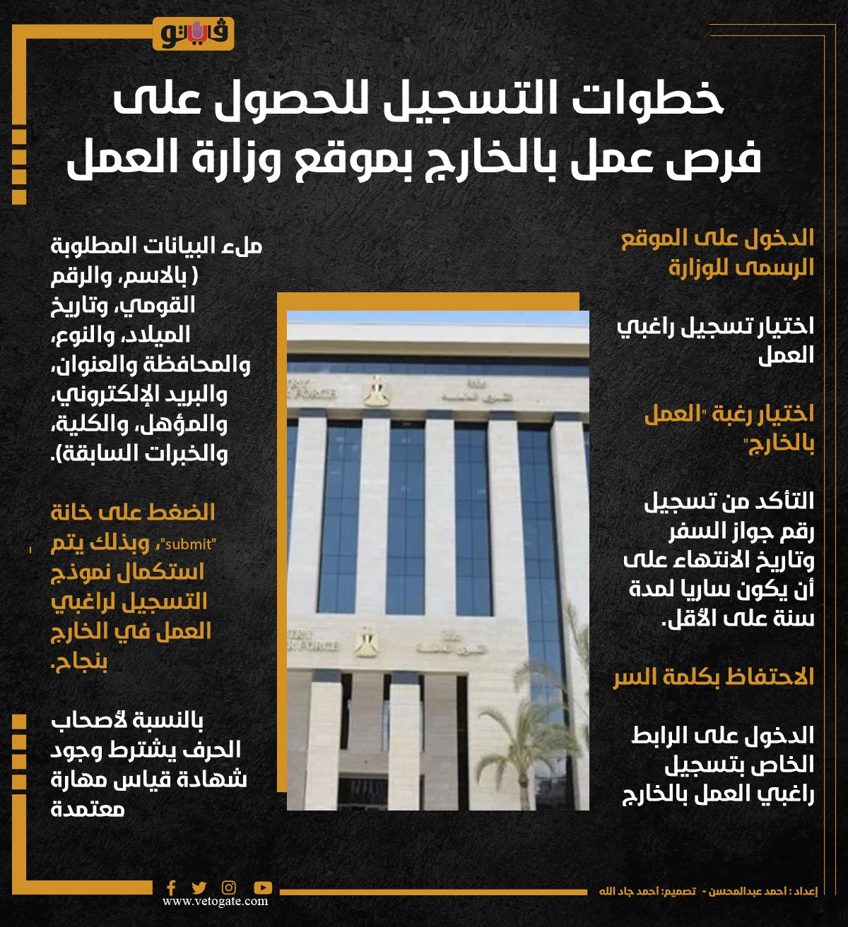 خطوات التسجيل للحصول على فرص عمل بالخارج بموقع وزارة العمل (إنفوجراف) الأربعاء 26/يونيو/2024 - 06:11 م 6/26/2024 6:11:28 PM وزارة العمل،فيتو أحمد عبدالمحسن شارك طباعة 18 حجم الخط شارك طباعة اصحاب الحرف فرص عمل بالخارج فرص عمل وزارة العمل البريد الالكترونى