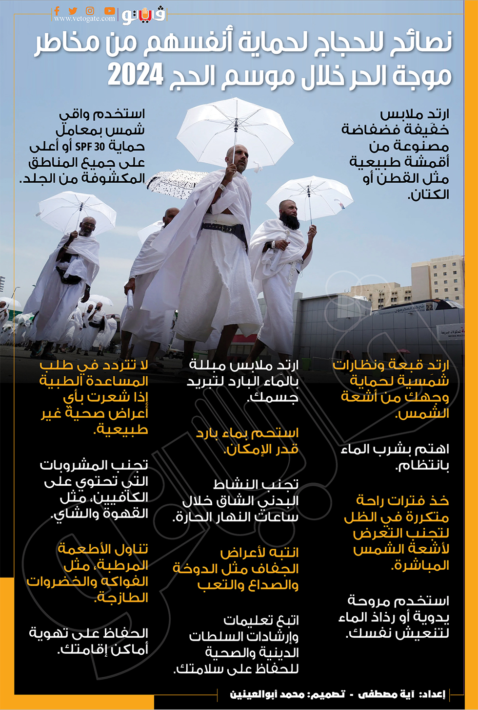 نصائح للحجاج لحماية أنفسهم من مخاطر موجة الحر خلال موسم الحج 2024 (إنفوجراف) الجمعة 14/يونيو/2024 - 04:25 م 6/14/2024 4:25:16 PM الحج، فيتو آية مصطفى شارك طباعة 18 حجم الخط شارك طباعة الحج 2024 الخضروات الطازجة الحمي الصفراء امراض مزمنة النشاط البدني درجات الحرارة المرتفعة لقاحات الانفلونزا نصائح للحجاج موسم الحج 2024