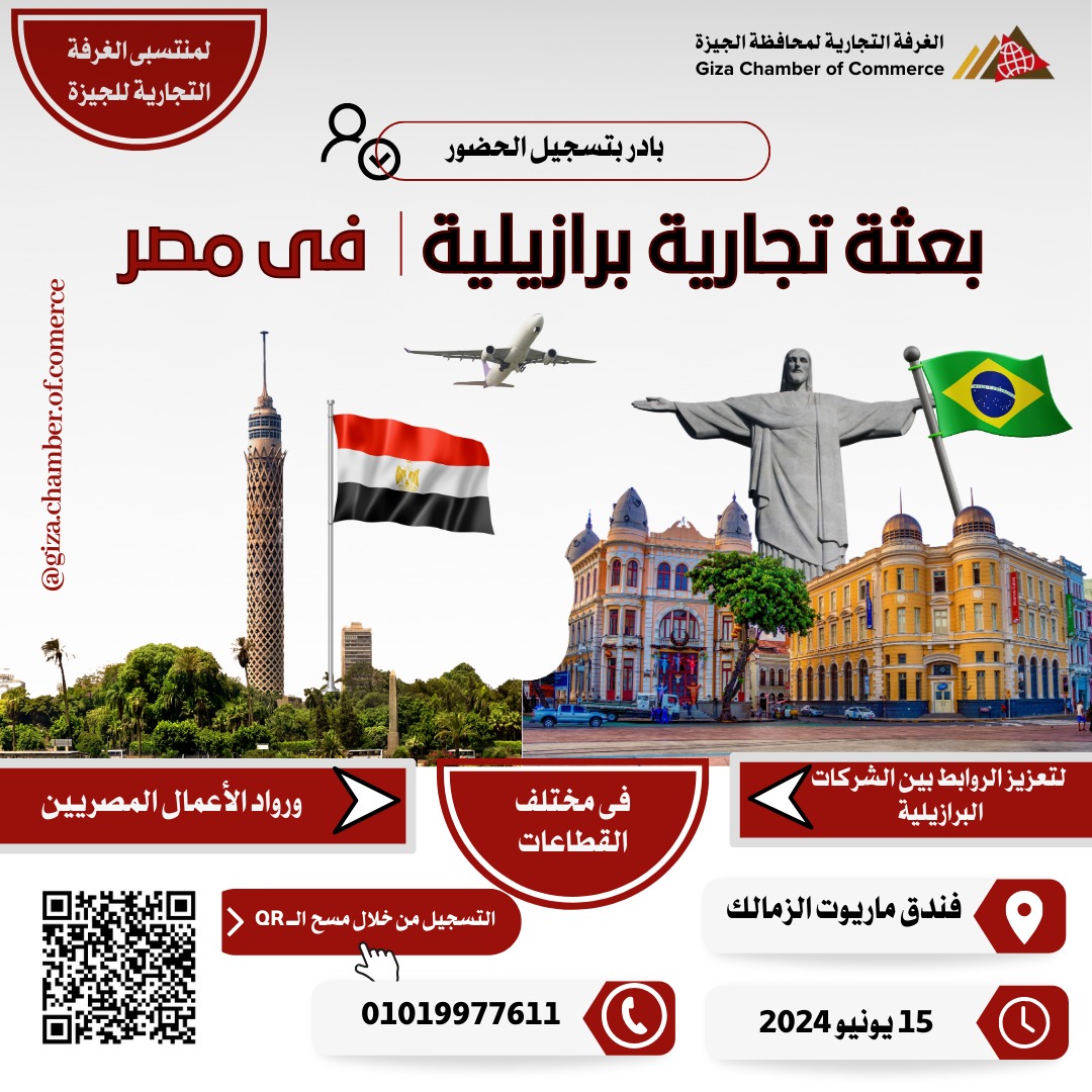 وأشار المهندس أسامة الشاهد رئيس الغرفة التجارية للجيزة إلى أن البعثة التجارية تهدف لتعزيز أواصر التعاون بين الشركات البرازيلية ورواد الأعمال المصريين واستهداف المستوردين والموزعين وتجار الجملة والشركات المحلية والوكالات الحكومية لاستكشاف الفرص التجارية ذات المنفعة المتبادلة.