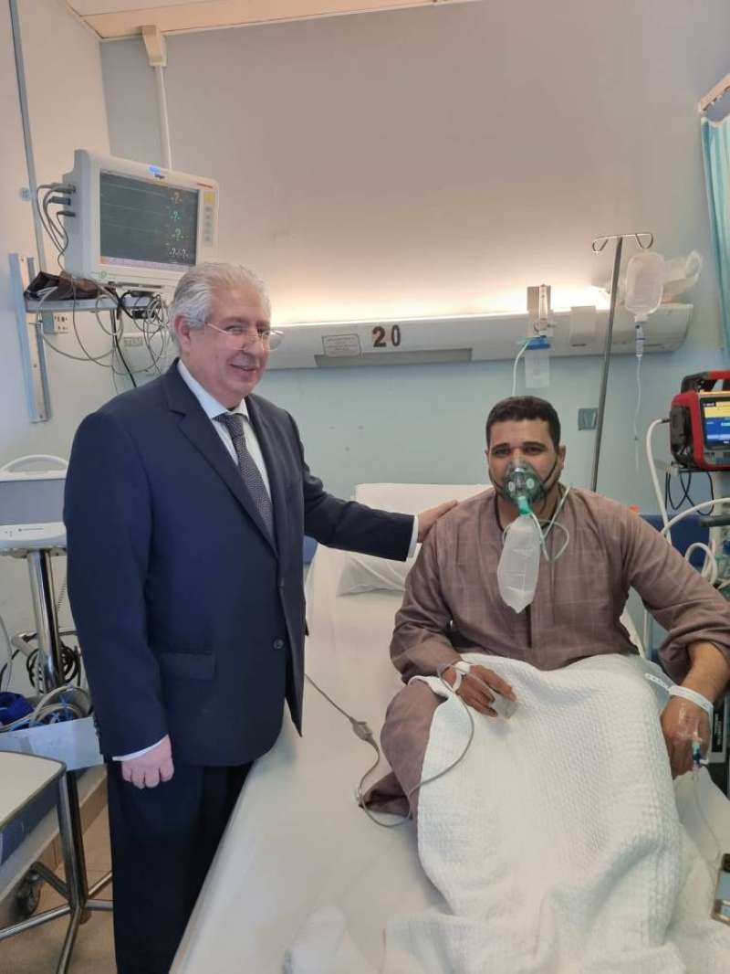 زار السفير المصري بالكويت، أسامة شلتوت، المواطن المصري طاهر محمد الذي يتلقى العلاج إثر حريق المنقف.