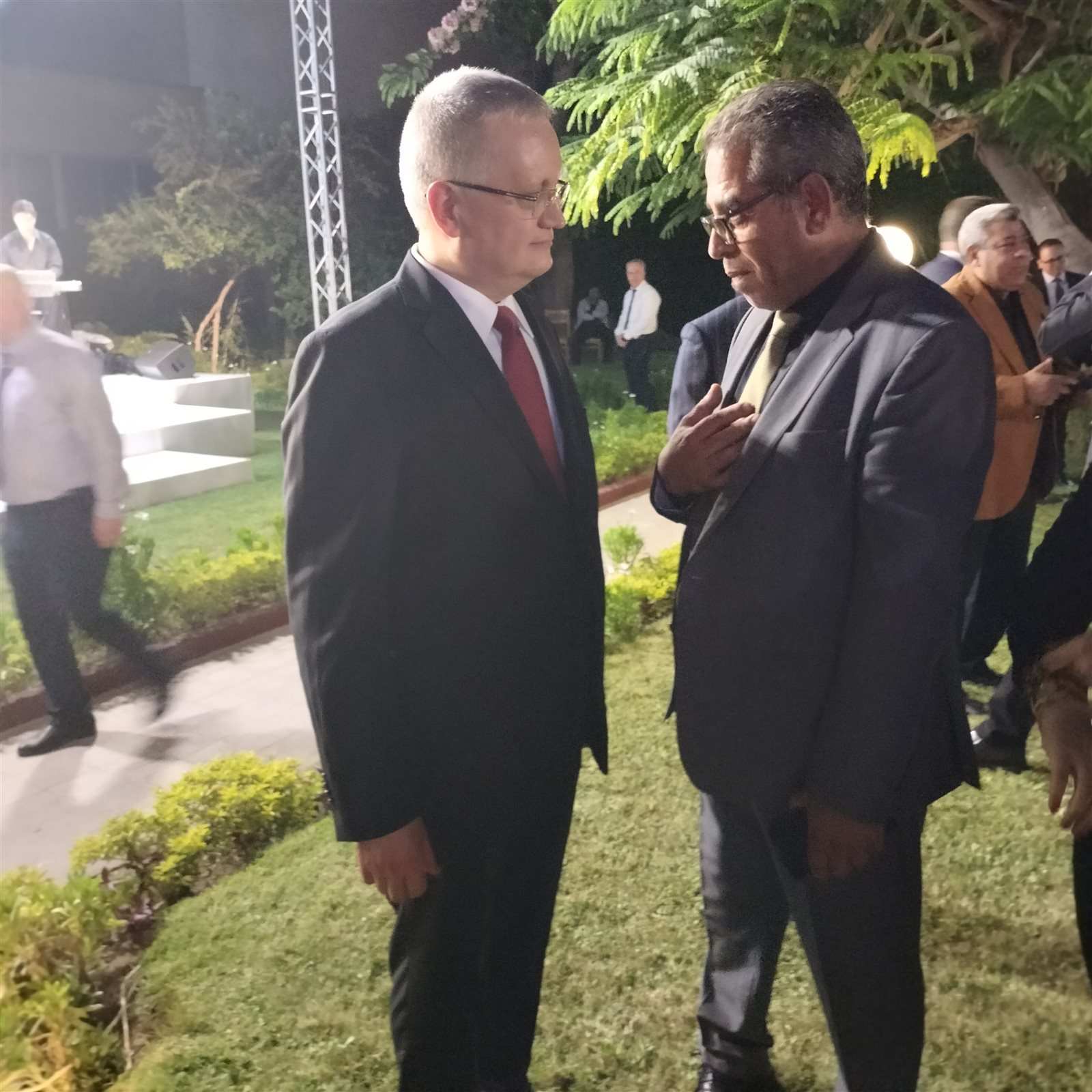 وكان من بين أول الوافدين إلى السفارة الروسية لحضور حفل الاستقبال بهذه المناسبة وزير الصحة الدكتور خالد عاطف عبد الغفار ووزير السياحة والآثار أحمد عيسى، ومساعد وزير الخارجية للشؤون الأوروبية السفير خالد عمارة وسفراء الدول والدبلوماسيين والإعلاميين.