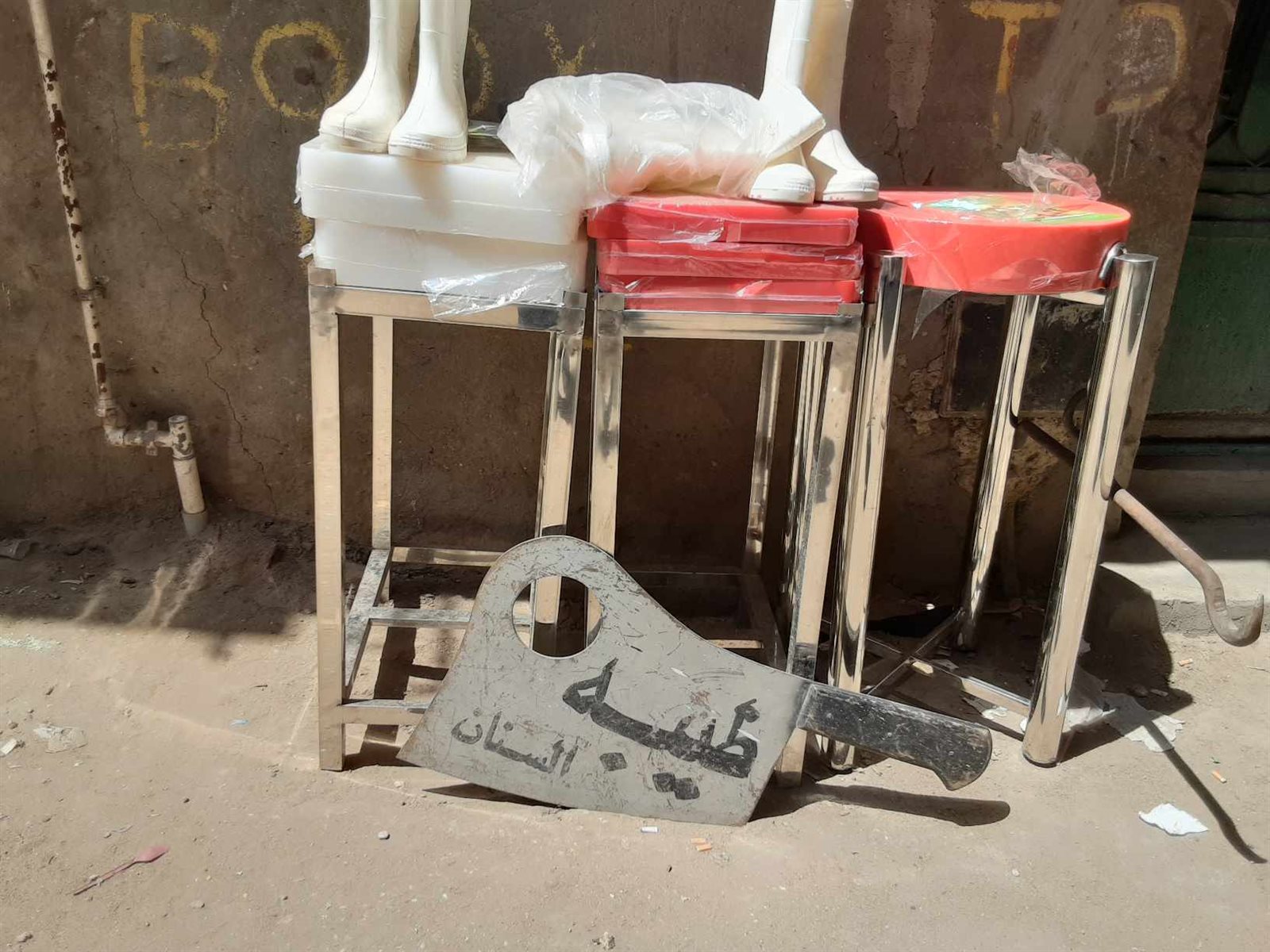 يحتاج الجزار عند ذبح الأضاحي، إلى استخدام أدوات الحماية التي يطلق عليها “مهمات الجزار”، التي تشمل الحذاء وحافظة السكاكين والآلات الحادة «جرابات».