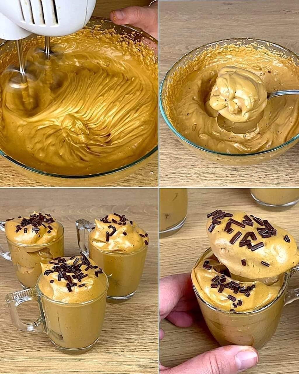 - يتم ضرب السكر والحليب والقهوة مع بعض عن طريق مضرب الكهرباء حتى الحصول على رغوة الكابتشينو.
