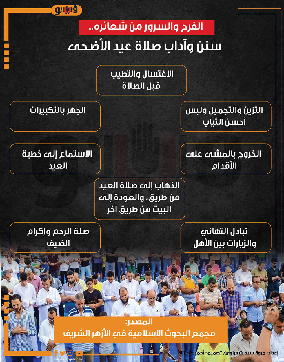 الفرح والسرور من شعائره.. سنن وآداب صلاة عيد الأضحى (إنفوجراف) السبت 15/يونيو/2024 - 01:27 م 6/15/2024 1:27:28 PM صلاة عيد الأضحى، فيتو مروة سيد شعراوي شارك طباعة 18 حجم الخط شارك طباعة أحكام صلاة عيد الأضحى شعائر صلاة عيد الأضحى المبارك سنن وآداب عيد الأضحى المبارك سنن صلاة العيد كيفية صلاة عيد الأضحى ضوابط صلاة عيد الأضحي حكم التكبيرات في العيدين أماكن صلاة عيد الأضحى أول أيام عيد الأضحى المبارك
