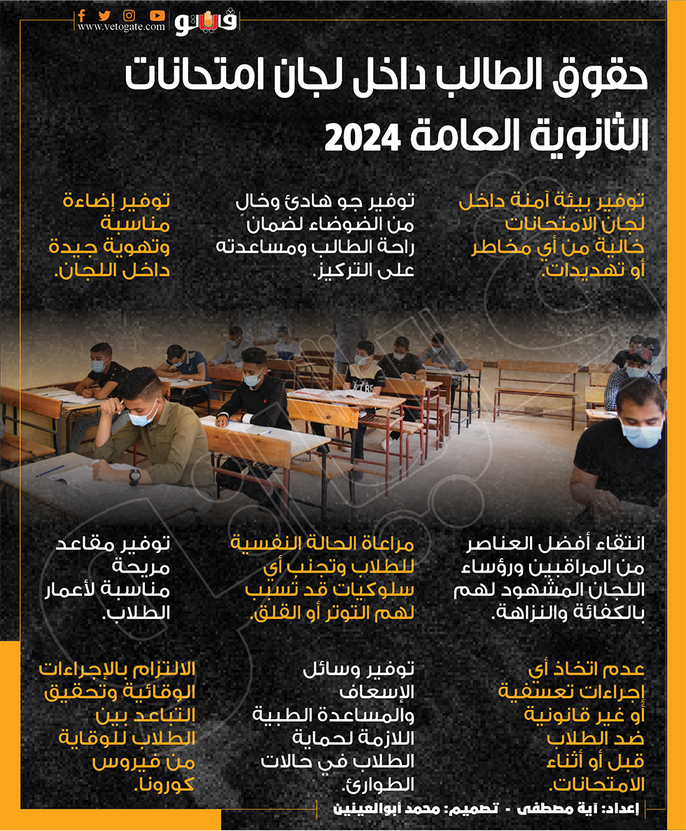حقوق الطالب داخل لجان امتحانات الثانوية العامة 2024 (إنفوجراف) الإثنين 17/يونيو/2024 - 12:54 م 6/17/2024 12:54:55 PM امتحانات الثانوية العامة آية مصطفى شارك طباعة 18 حجم الخط شارك طباعة الثانوية العامة امتحانات الثانوية العامة امتحانات الثانوية فيروس كورونا لجان امتحانات الثانوية العامة لجان امتحانات الثانوية