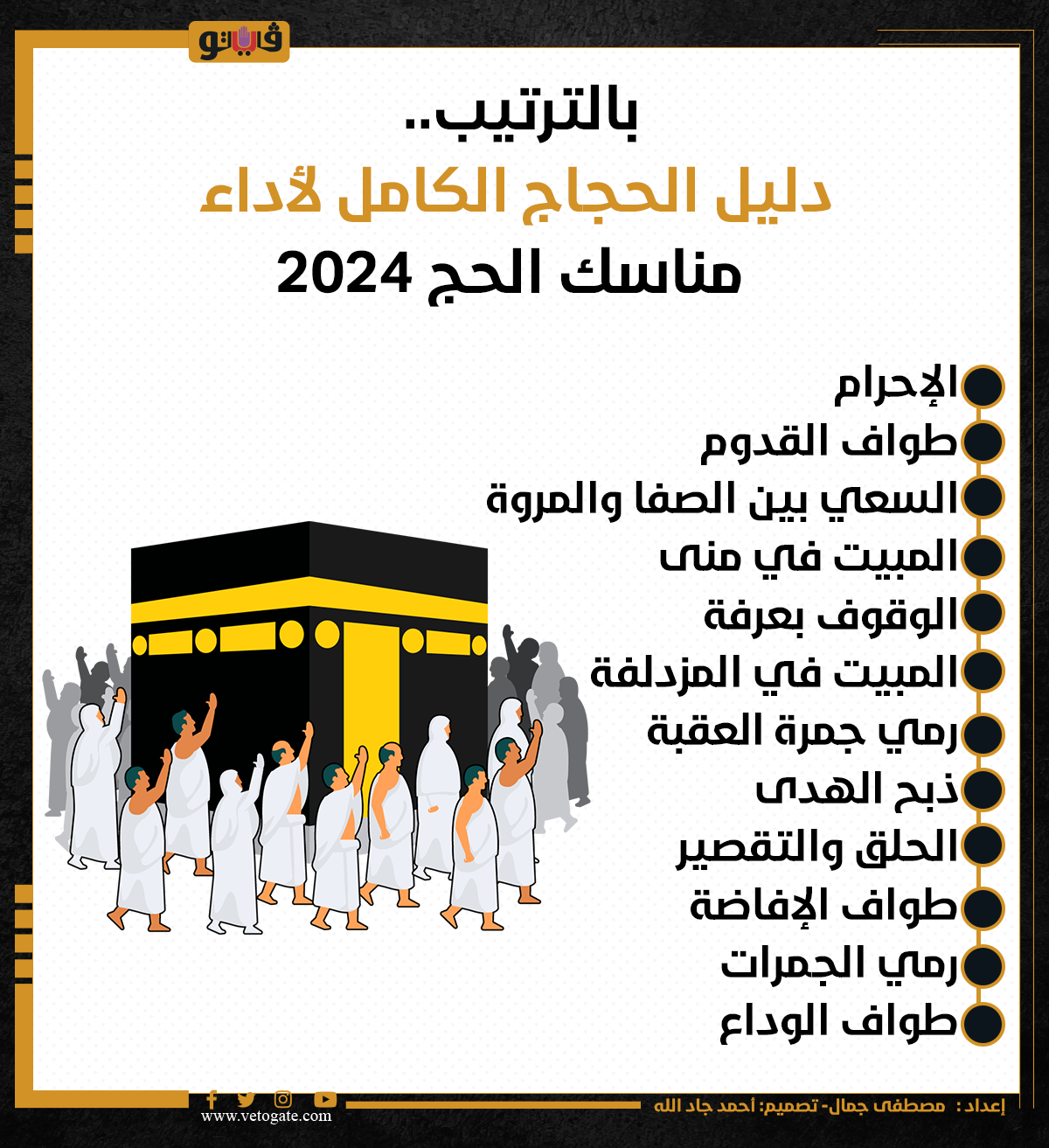 بالترتيب.. دليل الحجاج الكامل لأداء مناسك الحج 2024 (إنفوجراف) الخميس 13/يونيو/2024 - 06:00 م 6/13/2024 6:00:36 PM أعمال الحج مصطفى جمال شارك طباعة 18 حجم الخط شارك طباعة السعي بين الصفا والمروة الاحرام الوقوف بعرفة طواف الافاضة رمي الجمرات طواف الوداع المبيت في مني الصفا والمروة طواف القدوم رمي جمرة العقبة