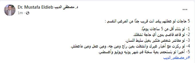 وعن أعراض قرب إصابة الشخص بالمرض النفسي، قال الدكتور مصطفى الديب: "5 حاجات لو عملتهم يبقى انت قريب جدًا من المرض النفسي: