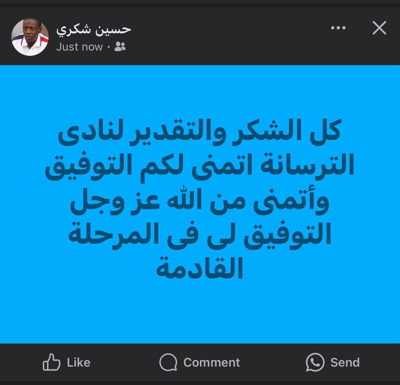 وأعلن الكابتن حسين شكري المدير الفني للترسانة اليوم الخميس عبر صفحته الشخصية علي فيسبوك رحيله عن تدريب الشواكيش.
