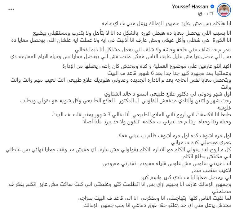 وكتب يوسف حسن عبر صفحته الرسمية على فيس بوك أكد خلاله أن إدارة الزمالك لا ترد على مكالماته وأنه بعد العملية الجراحية لا يتدرب ولا يقوم بالتأهيل والنادي لا يقوم بدفع مقابل ذلك.
