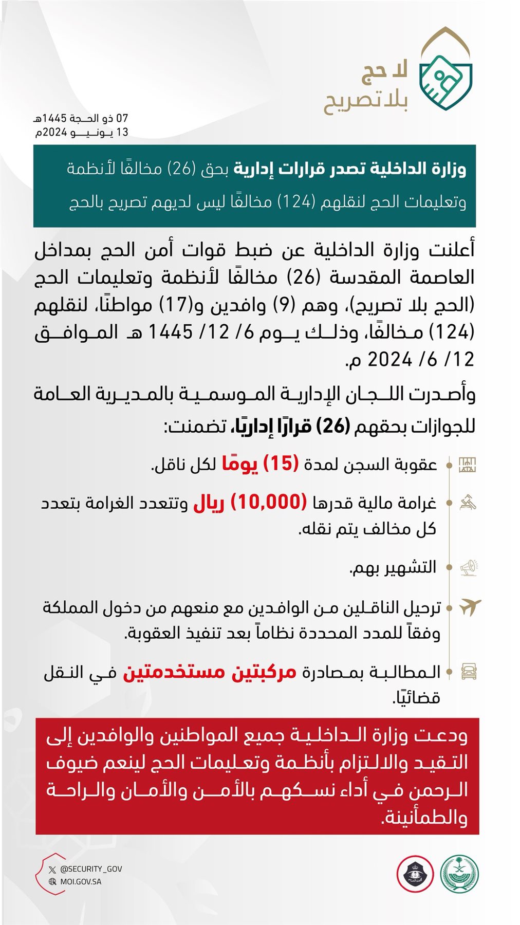 أصدرت وزارة الداخلية السعودية اليوم الخميس، قرارات إدارية بحق 26 مخالفًا لأنظمة وتعليمات الحج لنقلهم 124 شخصا ليس لديهم تصريح بالحج.