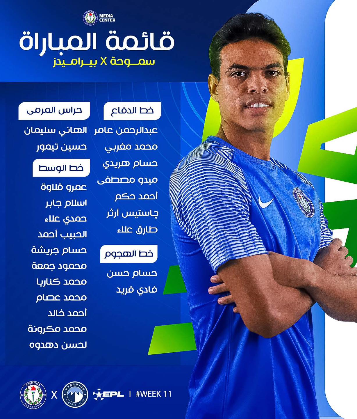 وأعلن أحمد سامي المدير الفني للفريق الأول لكرة القدم بنادي سموحة قائمة فريقه استعدادا لمواجهة بيراميدز في السابعة من مساء اليوم الخميس على استاد الدفاع الجوي في إطار اللقاء المؤجل من الجولة 11 من بطولة الدوري الممتاز.