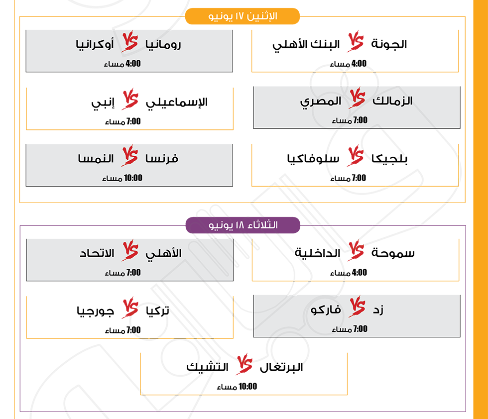 مباريات الأسبوع.. إسبانيا مع إيطاليا وفرنسا مع هولندا.. الدوري المصري الممتاز (إنفوجراف) الجمعة 14/يونيو/2024 - 07:22 م 6/14/2024 7:22:00 PM الأهلي، فيتو محمد سيد شارك طباعة 18 حجم الخط شارك طباعة الأهلي الزمالك ألمانيا اسبانيا إيطاليا هولندا فرنسا
