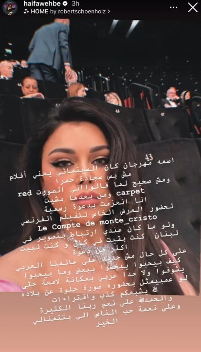 في هذا السياق، كتبت هيفاء وهبي، استوري عبر حسابها الشخصي بموقع انستجرام جاء فيه: اسمه مهرجان كان السينمائي، يعني أفلام مش بس سجادة حمراء، ومش صحيح أني اتصورت على الـ Red Carpet، ومن بعدها مشيت، أنا انعزمت لحضور العرض الخاص لـ فيلم Le Compet de monte_cristo.
