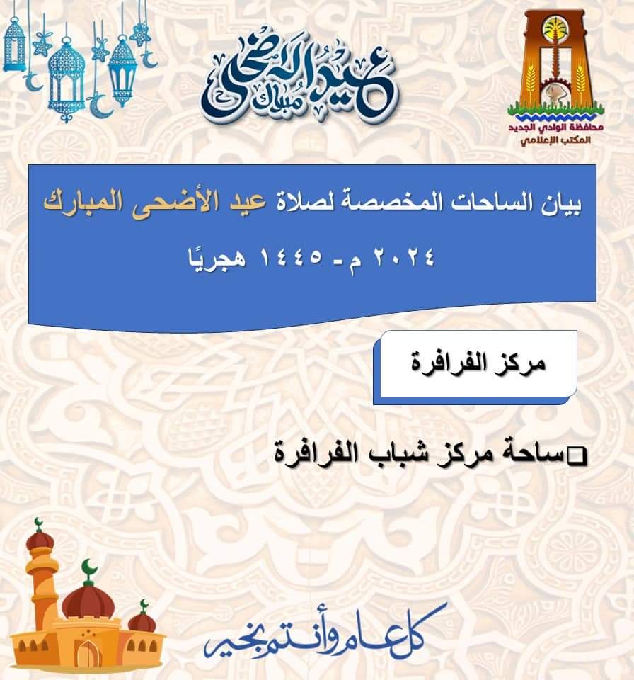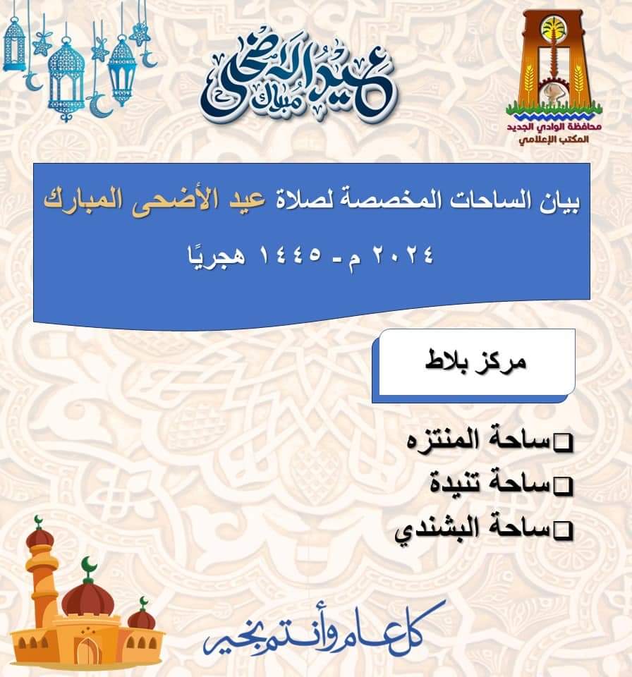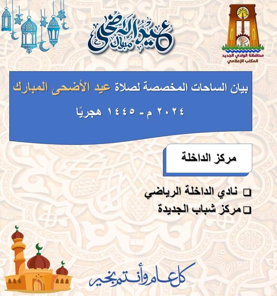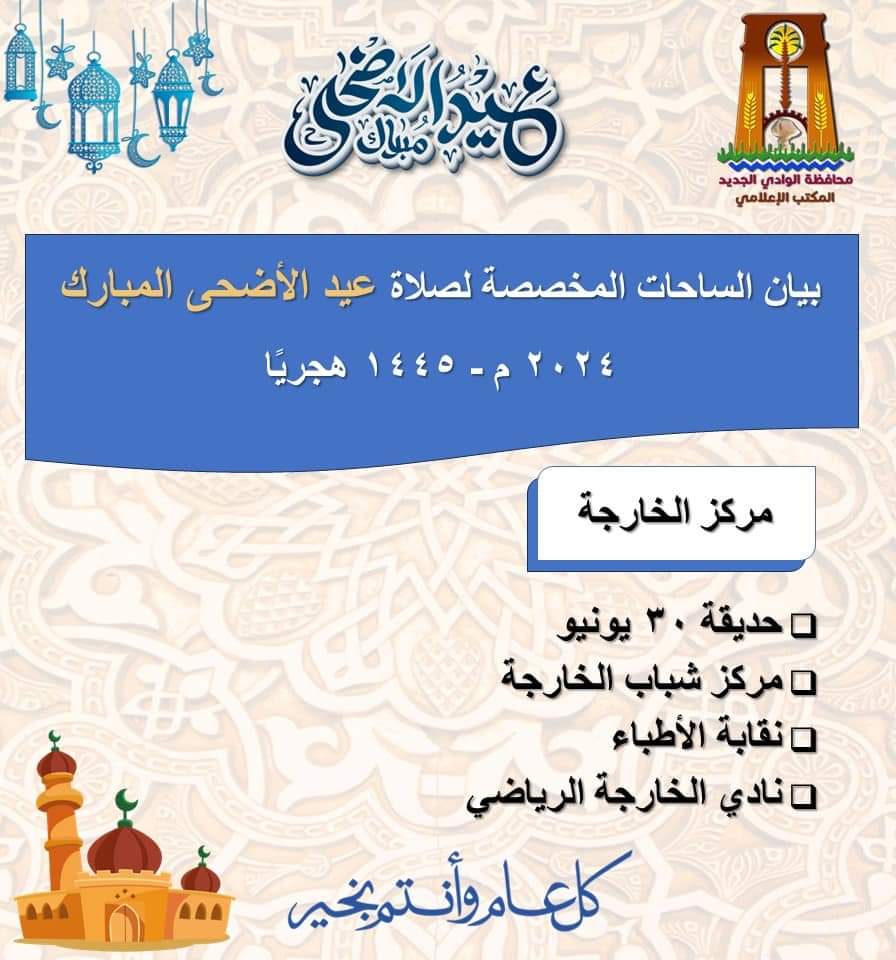 أعلن اللواء دكتور محمد الزملوط محافظ الوادي الجديد، الانتهاء من تجهيز وفرش 10 ساحات كبرى و202 مسجد لأداء صلاة عيد الأضحى المبارك على مستوى المحافظة، وتحديد إمام وخطيب بكل مسجد وساحة لأداء الشعائر بالتنسيق مع وزارة الأوقاف.