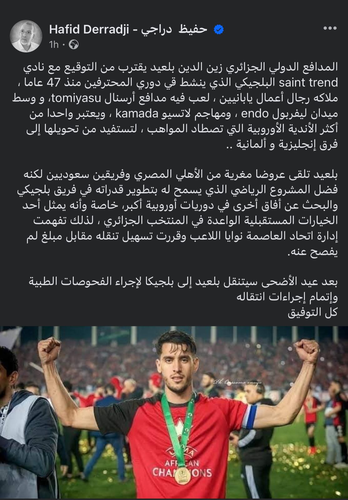 وتابع: "بعد عيد الأضحى سيتنقل بلعيد إلى بلجيكا لإجراء الفحوصات الطبية وإتمام إجراءات انتقاله، كل التوفيق".