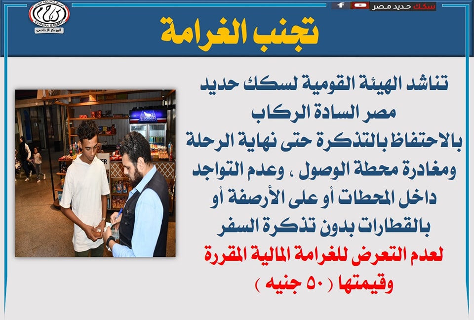 وناشدت الهيئة جمهور الركاب بالحصول على تذكرة السفر قبل استقلال القطار، مع التأكيد على مراجعة التذكرة بعد الحصول عليها من خلال كافة المصادر التي حددتها الهيئة، حتى لا يتعرض الركاب للغرامة الفورية