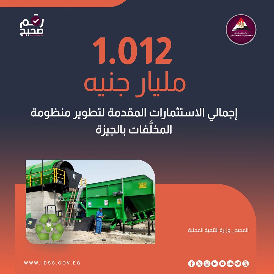 سلط مركز معلومات مجلس الوزراء الضوء على إجمالي الاستثمارات المقدمة لتطوير منظومة المخلفات بالجيزة.