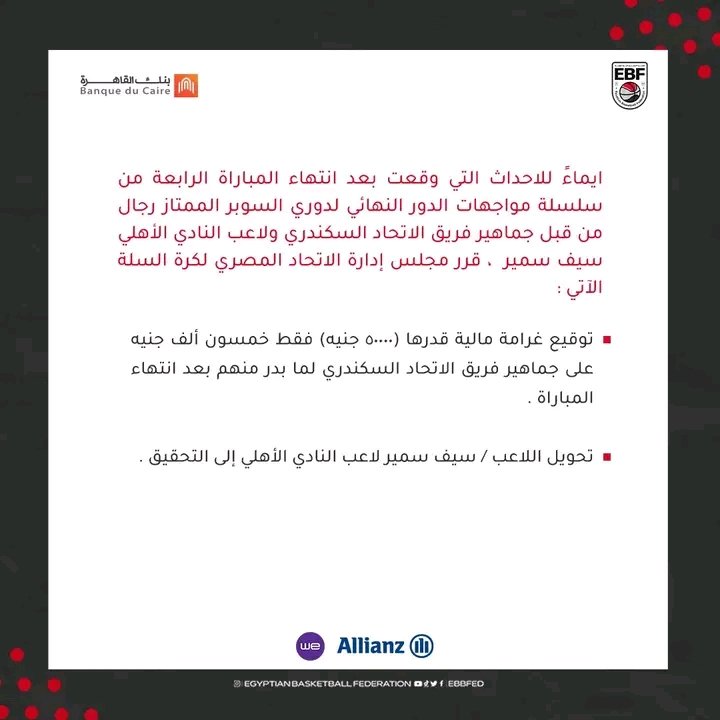 كما قرر مسؤولو الاتحاد المصري لكرة السلة، إحالة اللاعب سيف سمير قائد فريق سلة النادي الأهلي إلى التحقيق.
