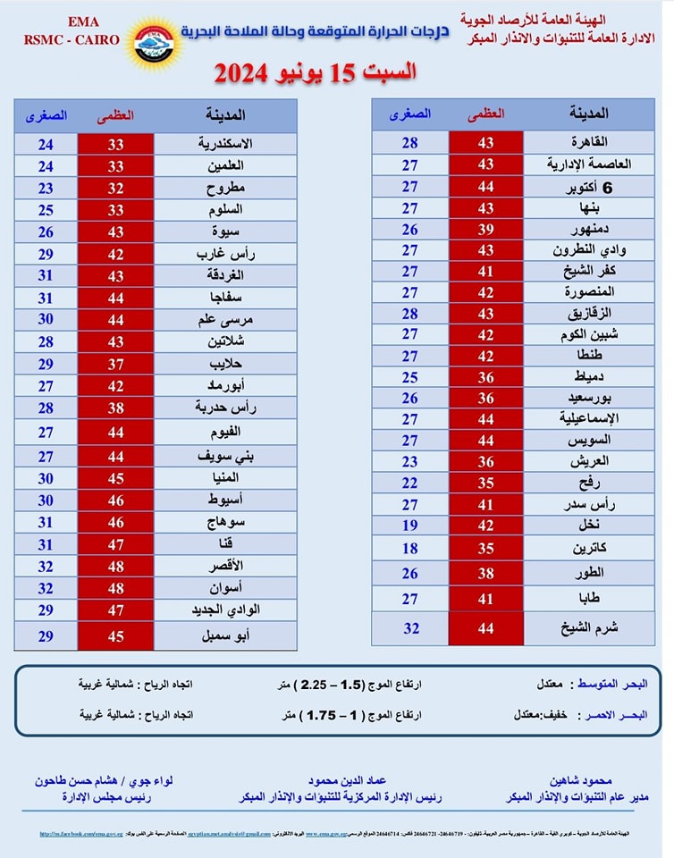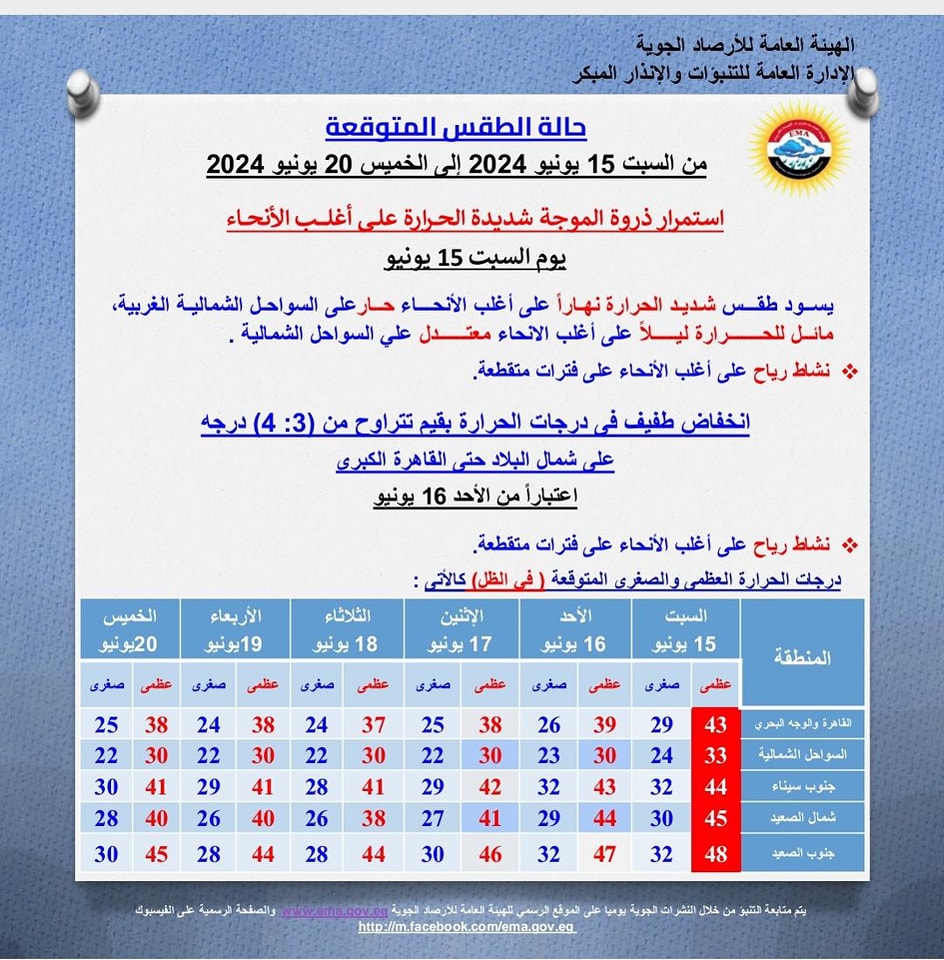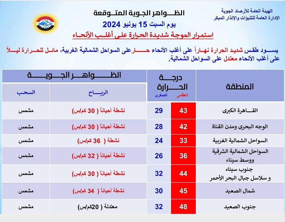 وأوضحت أنه من المتوقع اليوم السبت أن تكون ذروة الموجة شديدة الحرارة حيث من المتوقع أن تسجل القاهرة 43 درجة وجنوب الصعيد 48 درجة.