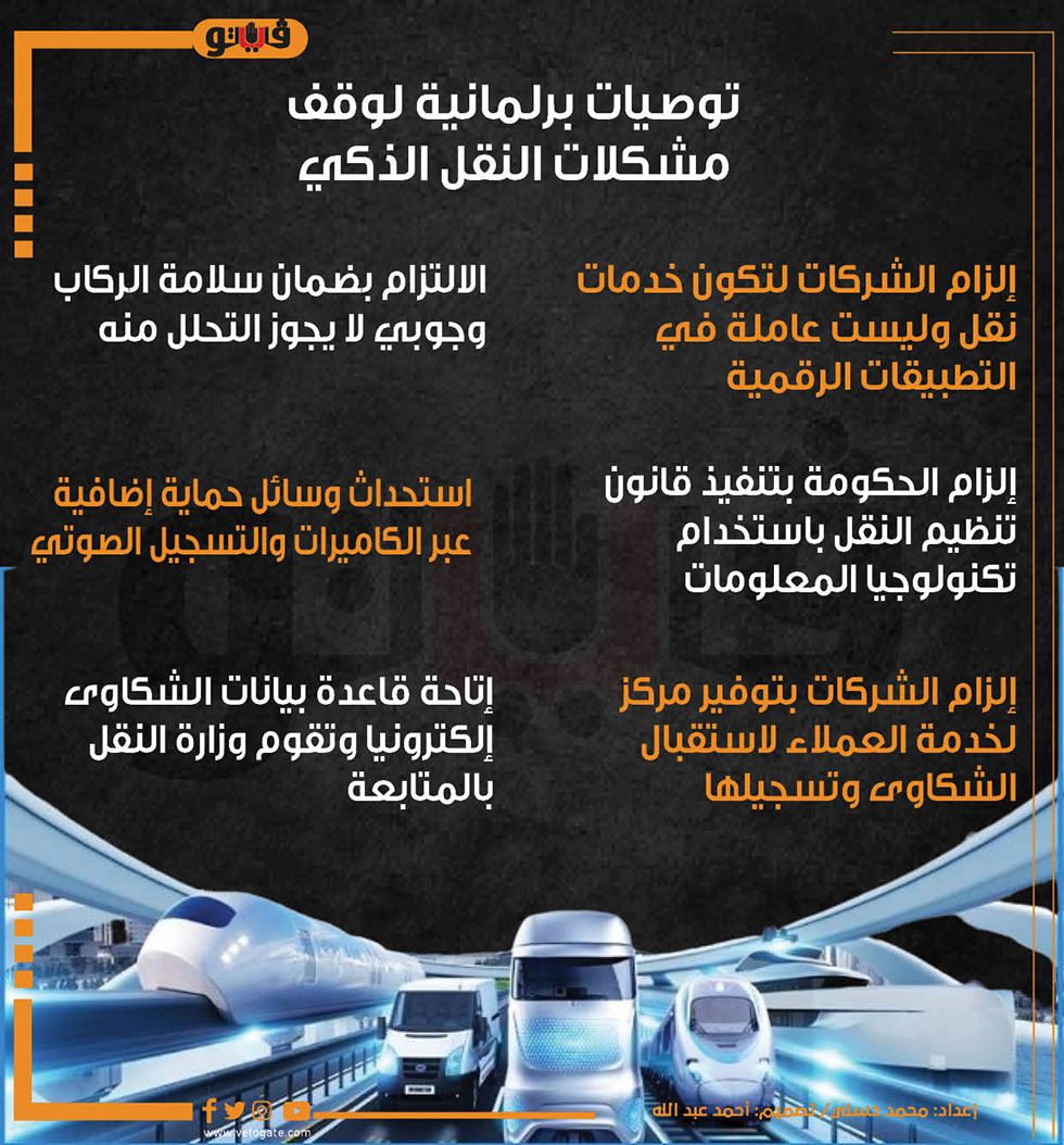 توصيات برلمانية لوقف مشكلات النقل الذكي (إنفوجراف) السبت 15/يونيو/2024 - 05:00 م 6/15/2024 5:00:04 PM محمد حسنى شارك طباعة 18 حجم الخط شارك طباعة
