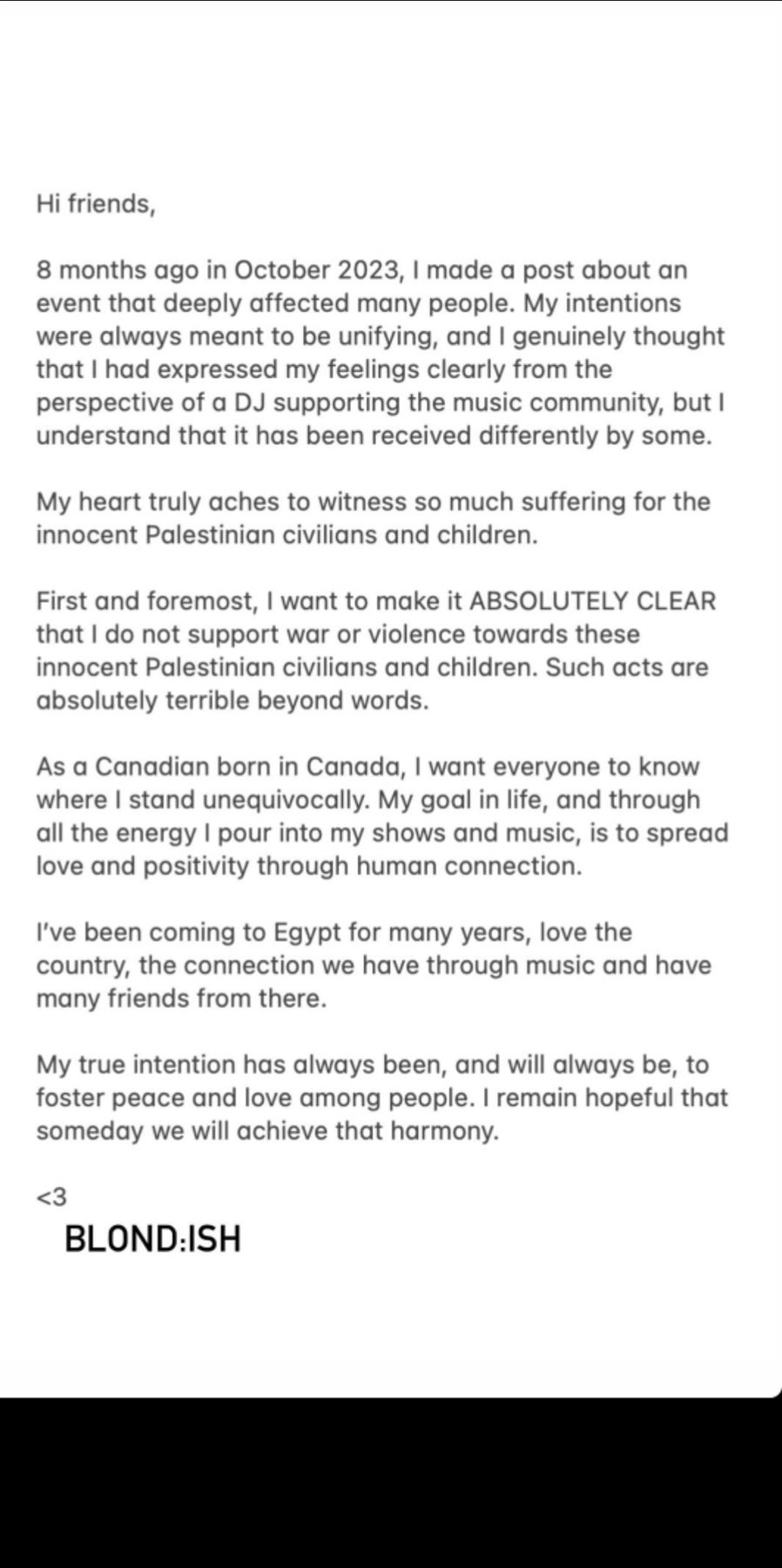 ومع زيادة الغضب تجاه حفلها قررت بلونديش أن تطلق بيانا استنكاريا وتُدافع عن أهالي فلسطين.. وقالت عبر حسابها بإنستجرام: منذ 8 أشهر، في أكتوبر 2023، كتبت عن حدث أثر في حياة العديد من البشر، ونوايايا دوما للتوحيد، وتوقعت أنني أوصلت مشاعري بطريقة واضحة من منظور لاعبة DJ تدعم الموسيقى، لكنني تفهمت أنها وصلت بطريقة خاطئة للبعض.. فأنا مازال قلبي يؤلمني جدا وهو يشاهد معاناة المدنيين الفلسطينيين الأبرياء والأطفال، وأريد توضيح في البداية أني لا أدعم الحرب أو العنف تجاه هؤلاء المدنيين الفلسطينيين والأطفال، هذه الأفعال مريعة بالطبع وفوق الوصف بالكلمات وبصفتي كندية مولودة بكندا، أريد للجميع أن يعلموا بطريقة لا لبس فيها، أن هدفي في الحياة ومن خلال كل الطاقة التي أقدمها في حفلاتي والموسيقى هو نشر الحب والإيجابية من خلال الاتصال الإنساني.
