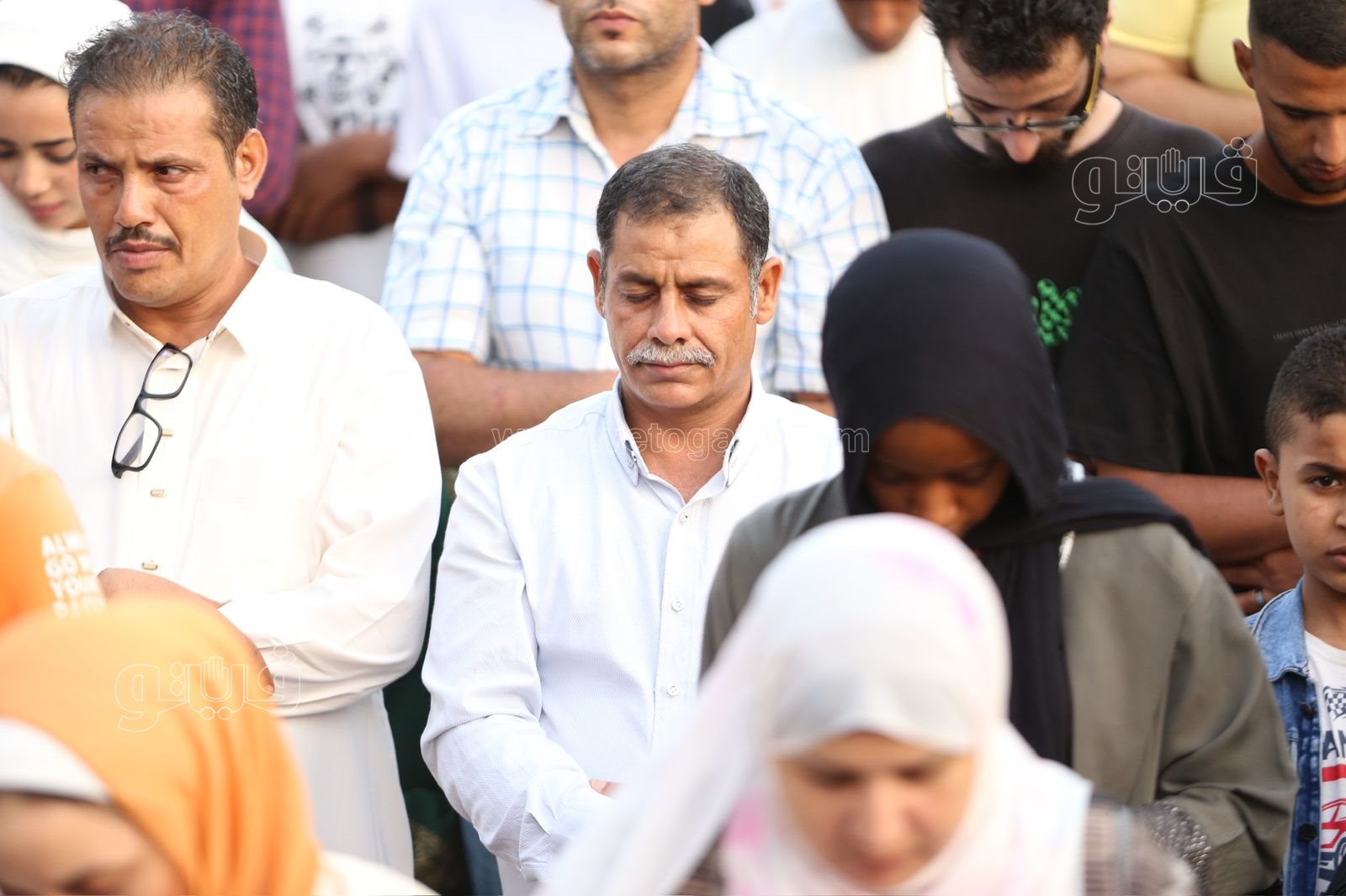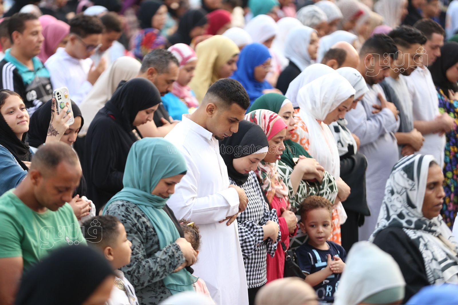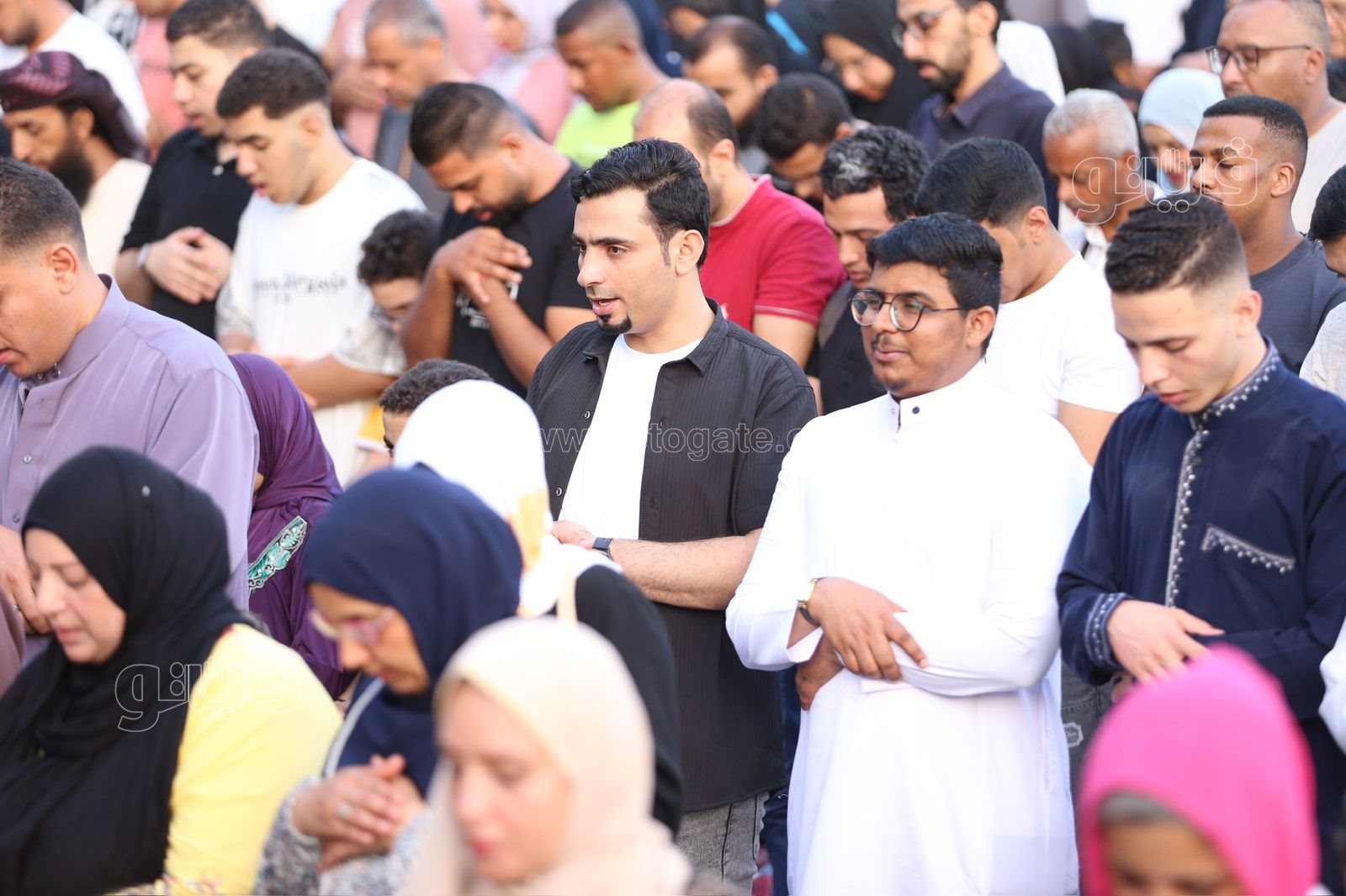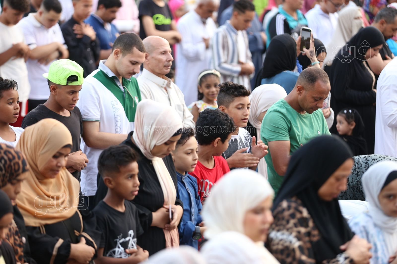 وكان مركز الأزهر أجاب عن السؤال حكم صلاة لرجال إلى جوار النساء في صلاة العيد قائلًا خروج المسلمين رجالًا ونساء وأطفالًا لصلاة العيد أمر مستحب؛ ليكبروا الله ويشهدوا الخير. وينبغي الفصل بين الرجال والنساء إذا أقيمت الصلاة، فيصطف الرجال في الصفوف الأولى ثم الصبيان ثم النساء؛ ولا تقف المرأة عن يمين الرجل ولا عن شماله؛ فعن أبي مالك الأشعري رضي الله عنه قال: ألا أحدثكم بصلاة النبي ﷺ: «فَأَقَامَ الصَّلَاةَ، وَصَفَّ الرِّجَالَ وَصَفَّ خَلْفَهُمُ الْغِلْمَانَ، ثُمَّ صَلَّى بِهِمْ فَذَكَرَ صَلَاتَهُ»، ثُمَّ قَالَ: «هَكَذَا صَلَاةُ -قَالَ عَبْدُ الْأَعْلَى: لَا أَحْسَبُهُ إِلَّا قَالَ: صَلَاةُ أُمَّتِي-». [أخرجه أبو داود].