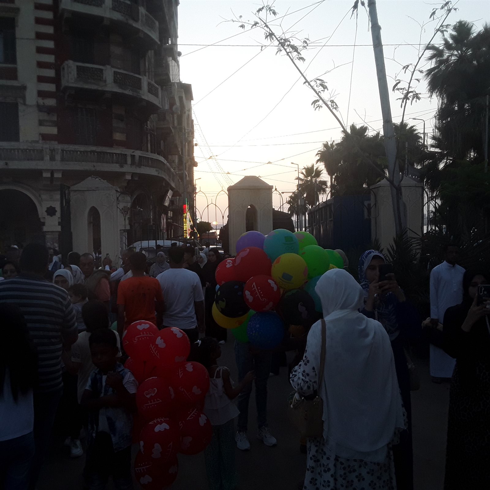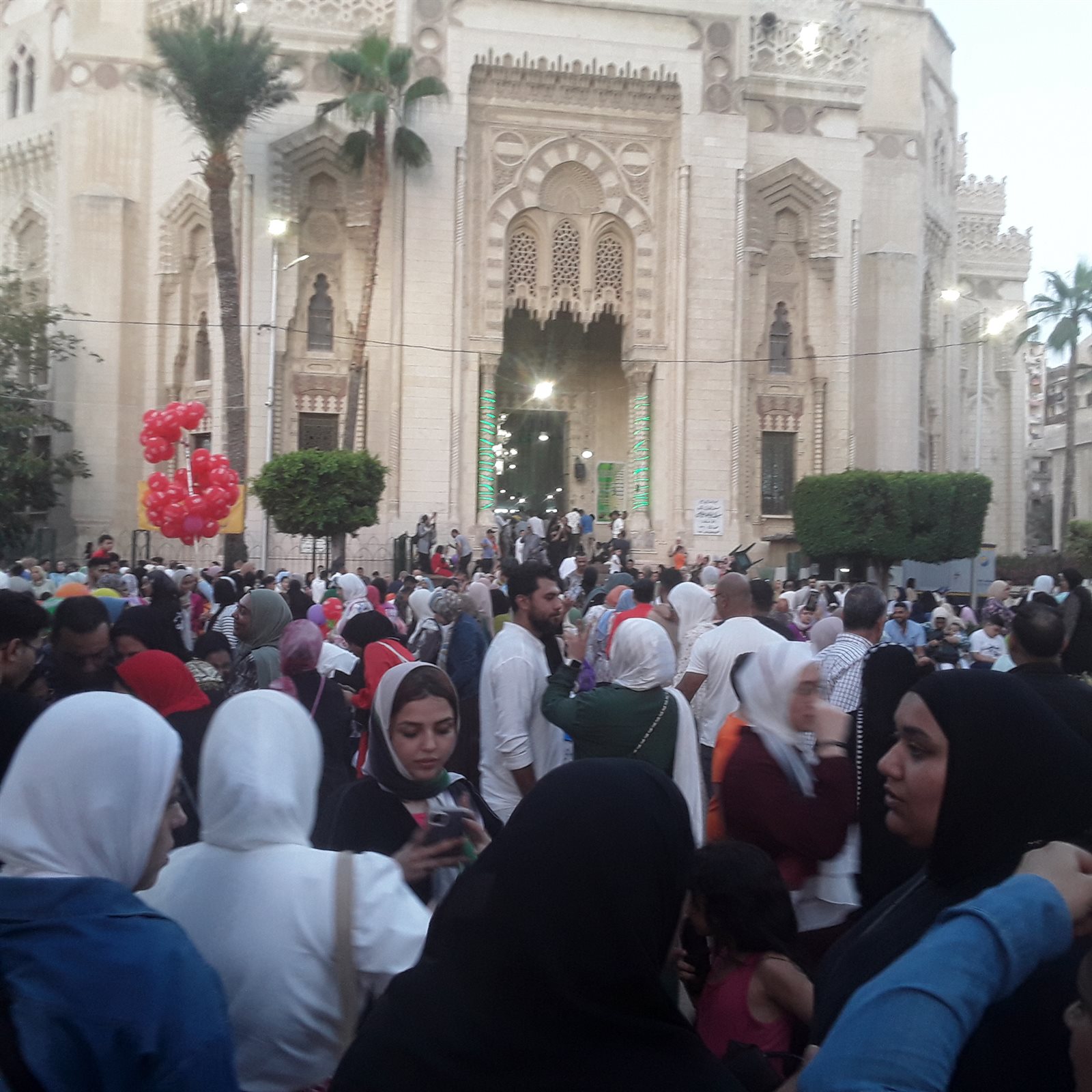 وحرص أهالي الإسكندرية من السيدات على التزاحم بساحة المسجد لحجز الأماكن المخصصة لهم لأداء الصلاة وسط انتشار الباعة الجائلين لبيع البالونات الملونة على الأطفال.