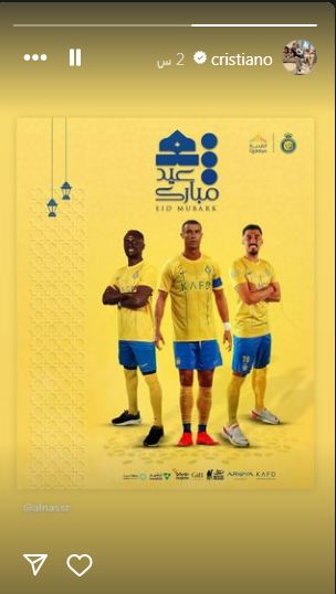 ونشر رونالدو منشور عبر قصة صفحته الرسمية بموقع الفيديوهات والصور "إنستجرام"، مرتديا زي النصر السعودي ومقدما التهنئة بمناسبة عيد الأضحى المبارك.
