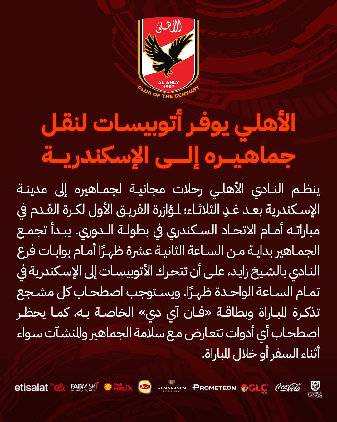 أعلن النادي الأهلي عبر صفحته الرسمية على موقع التواصل الاجتماعي فيسبوك، توفير أتوبيسات لنقل جماهير الفريق إلى الإسكندرية لمتابعة مباراة الفريق أمام الاتحاد السكندري.