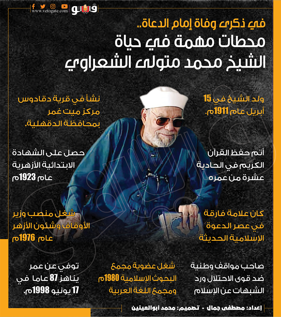 في ذكرى وفاة إمام الدعاة.. محطات مهمة في حياة الشيخ محمد متولى الشعراوي (إنفوجراف) الإثنين 17/يونيو/2024 - 06:08 م 6/17/2024 6:08:18 PM الشيخ محمد متولى الشعراوي، فيتو مصطفى جمال شارك طباعة 18 حجم الخط شارك طباعة الشيخ محمد متولي الشعراوي متولى الشعراوى البحوث الإسلامية محمد متولي الشعراوي