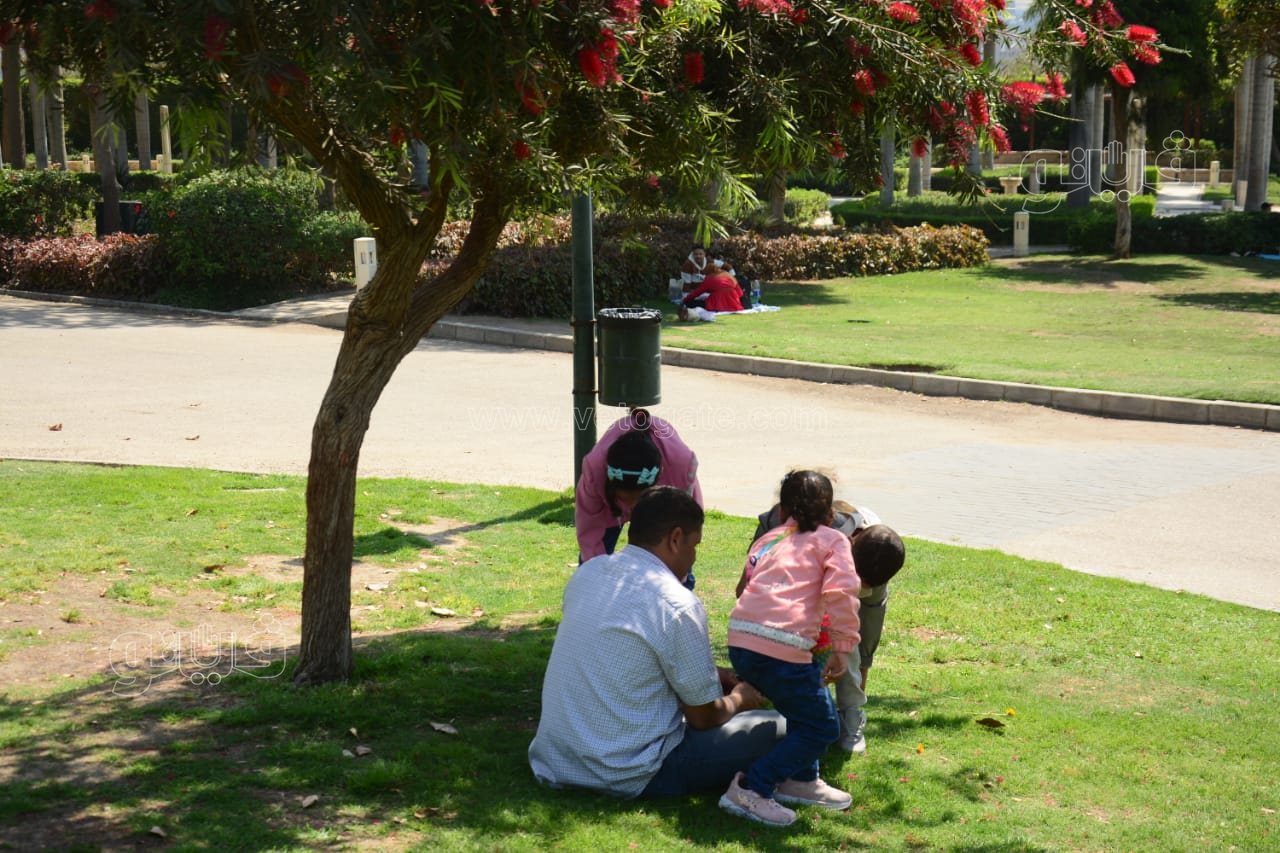 قام عدد كبير من زوار حديقة الأزهر اليوم الإثنين، بالجلوس أسفل الأشجار الشاهقة للوقاية من أشعة الشمس الحارقة في ثاني أيام عيد الأضحى.
