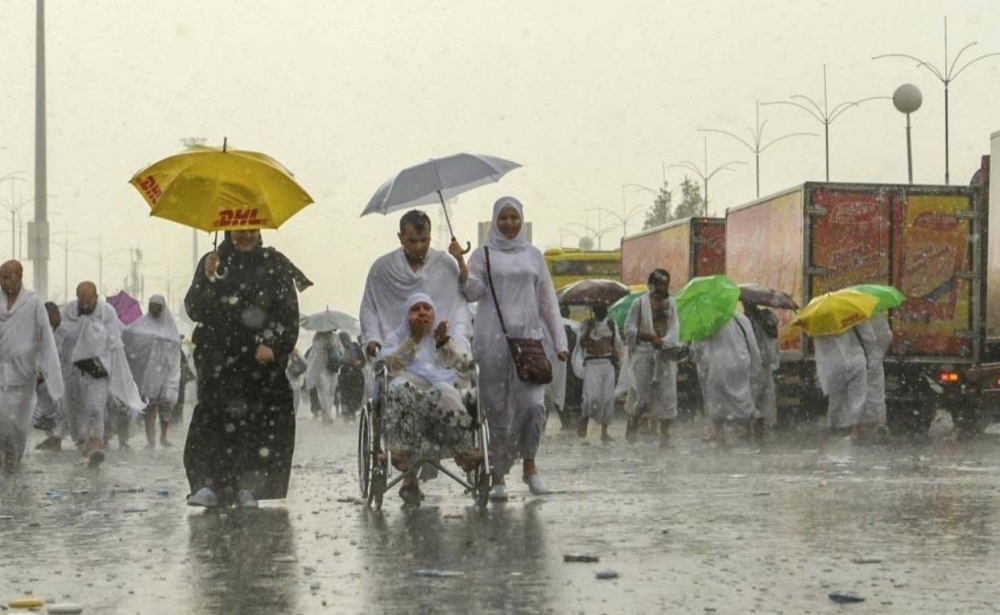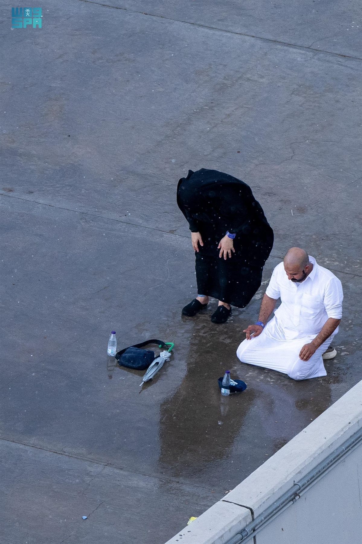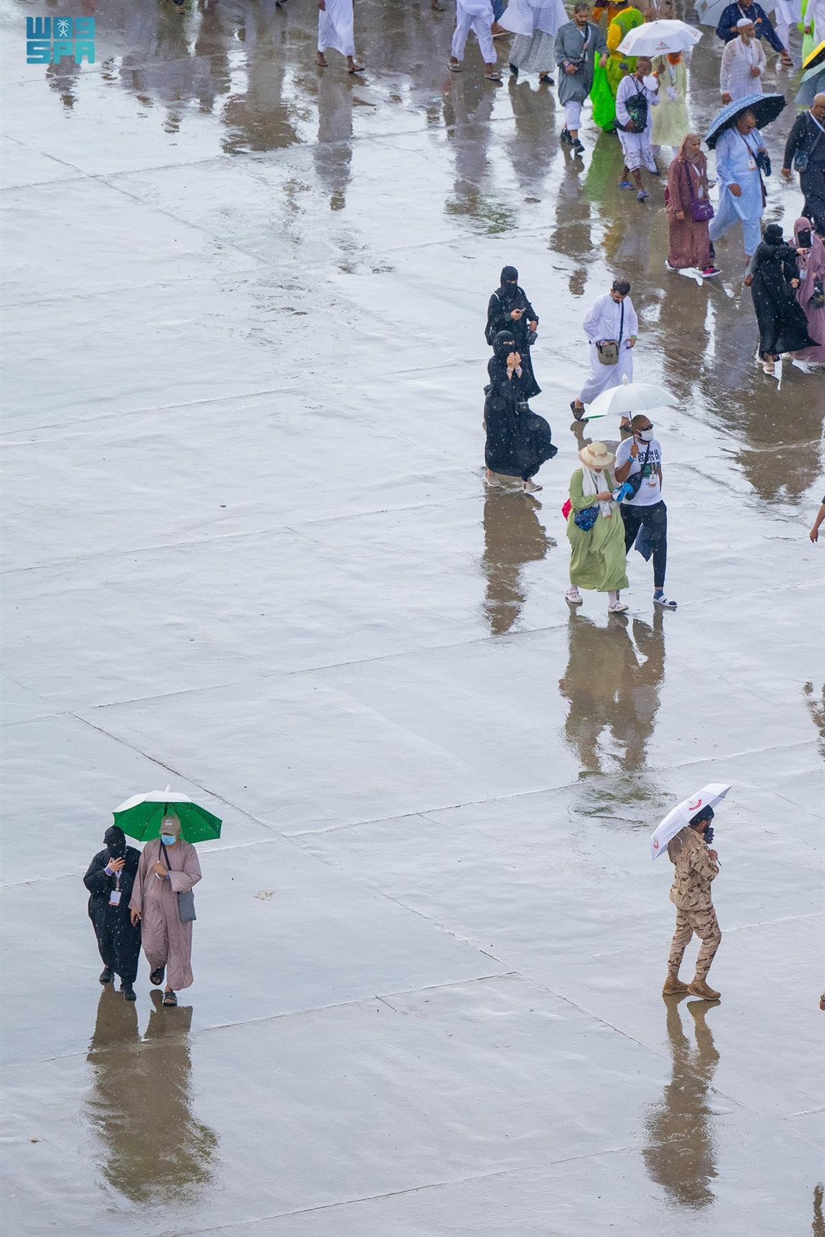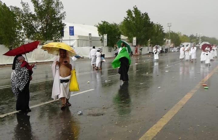 مشاهد مبهجة لضيوف الرحمن تحت الأمطار الغزيرة (صور)