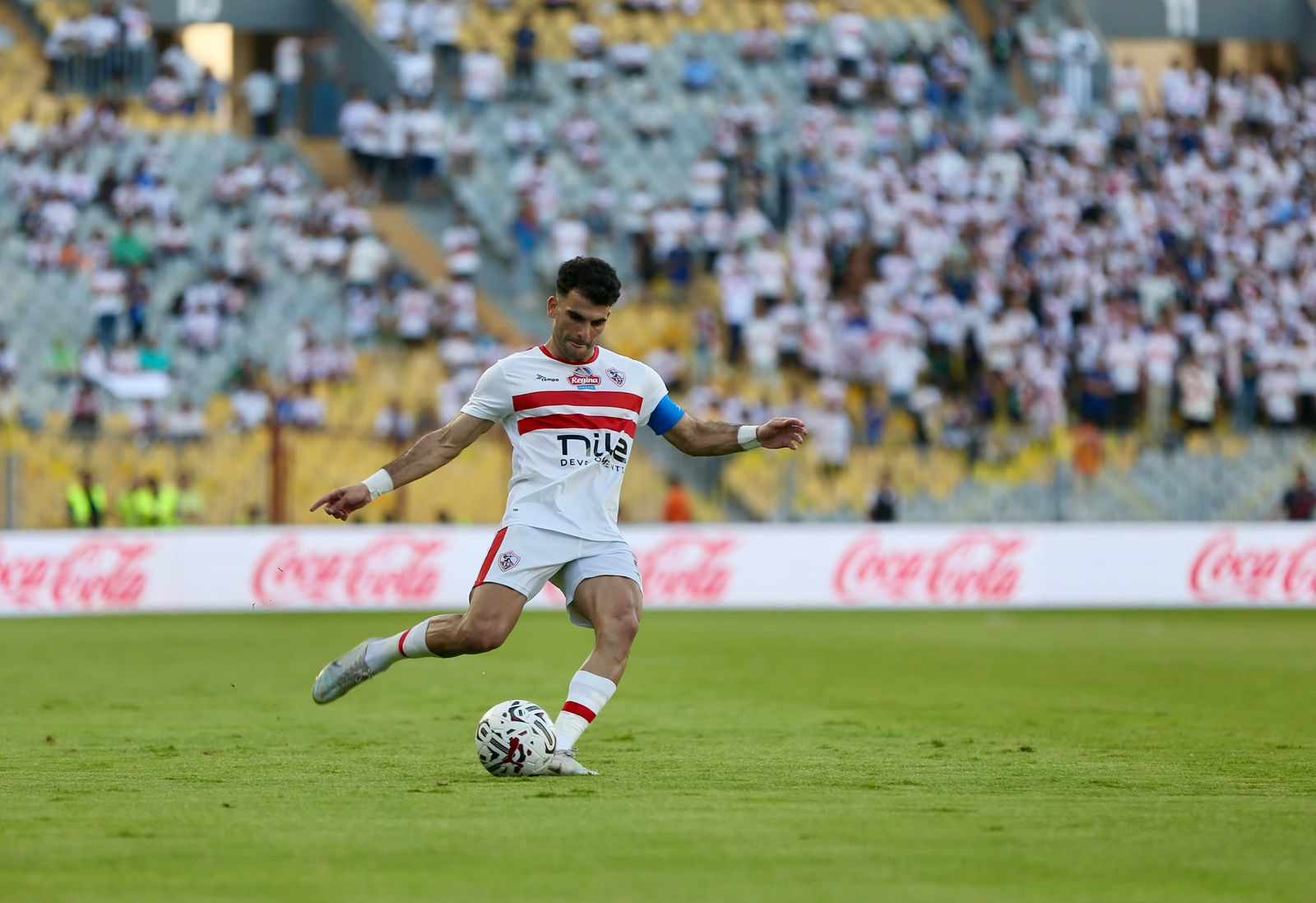وتشهد الدقيقة 40 ركلة حرة للزمالك في منتصف ملعب المصري جهة اليسار بعد إعاقة من عبد الرحيم دغموم لمحاولة مرور إبراهيما نداي، سددها قوية من أحمد سيد زيزو من خارج منطقة الجزاء مرت بجوار القائم الأيسر بقليل.