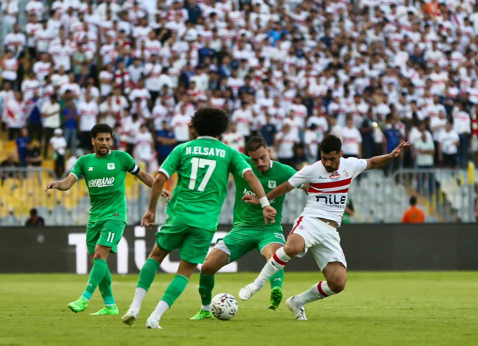 وتشهد الدقيقة 40 ركلة حرة للزمالك في منتصف ملعب المصري جهة اليسار بعد إعاقة من عبد الرحيم دغموم لمحاولة مرور إبراهيما نداي، سددها قوية من أحمد سيد زيزو من خارج منطقة الجزاء مرت بجوار القائم الأيسر بقليل.