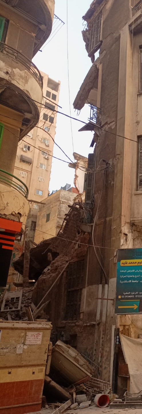 انهار الجزء الخلفي من عقار رقم ٧٢ شارع بورسعيد التابع لحي وسط الإسكندرية، دون إصابات أو خسائر بشرية وهو عقار خالٍ من السكان ومكون العقار دور أرضي بدروم و3 أدوار علوية حوائط حاملة.