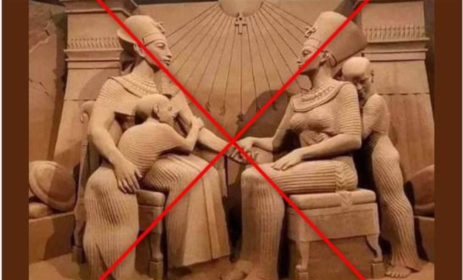 الملك إخناتون، انتشر مؤخرا على نطاق واسع بمواقع التواصل الاجتماعي صورة يدّعي ناشروها أنّها لمنحوتة صنعها المصريّون القدماء تمثّل "حبّ الملك إخناتون لزوجته نفرتيتي.