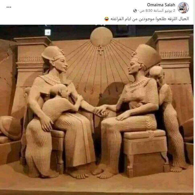جاء في التعليق المرافق "حب الملك إخناتون لزوجته نفرتيتي... حب خلّدته جدران معابد المصريين القدماء"، في إشارة إلى أنّ هذه المنحوتة ترجع إلى حقبة مصر القديمة.