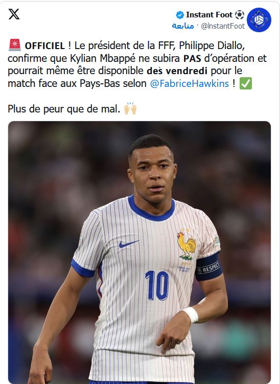 كما أكد رئيس الاتحاد الفرنسي لكرة القدم فيليب ديالو، أن مبابي ليس بحاجة للخضوع لعملية جراحية في الأنف.