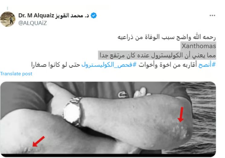 وقال الدكتور "محمد القويز" عبر صفحته إكس، إن نتوءات صغيرة ظهرت بوضوح على ذراع الكابتن الراحل، موضحًا أن اسمها العلمي Xanthomas (الورم الأصفر)؛ والتي تنجم عن تسرب بروتينات المصل الشحمية عبر جدران الأوعية الدموية إلى الجلد، والتي تظهر عادة على الجفون واليدين والأرجل.