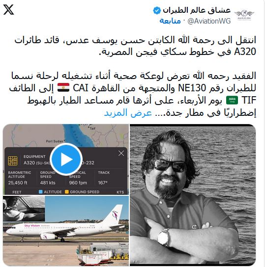 الطيار المصري، أثارت وفاة الطيار المصري حسن عدس خلال تشغيله رحلة كانت متجهة من القاهرة إلى مطار الطائف فضول رواد مواقع التواصل الاجتماعي، خاصة أن زميله أعلن رحيله عبر مكبر الصوت، مغيرًا مسار الرحلة لتهبط في مطار جدة بشكل طارئ.